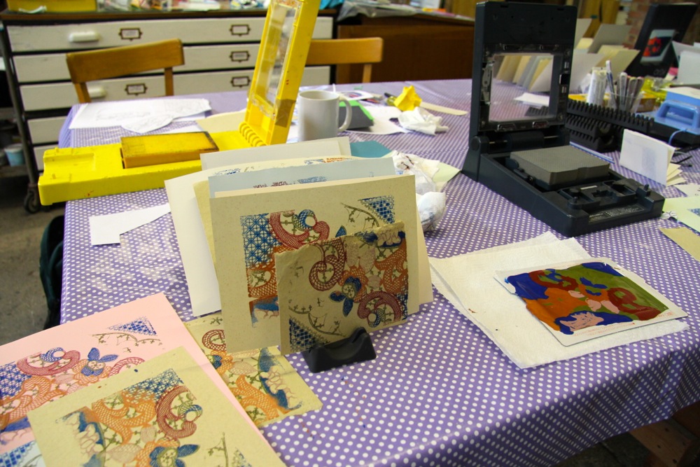 On booking you will be sent details of the types of artwork that work best with this system. You can bring along artwork to use or create or copy something on the day. The general rule is to use clear black and white lineart with good contrast, and avoid grey tones and shading. You can bring along images on a memory stick, or print outs at A6 (postcard) size. If you don’t have your own design to work with, you can pick something from the studio’s design library with hundreds of illustrated and vintage books.