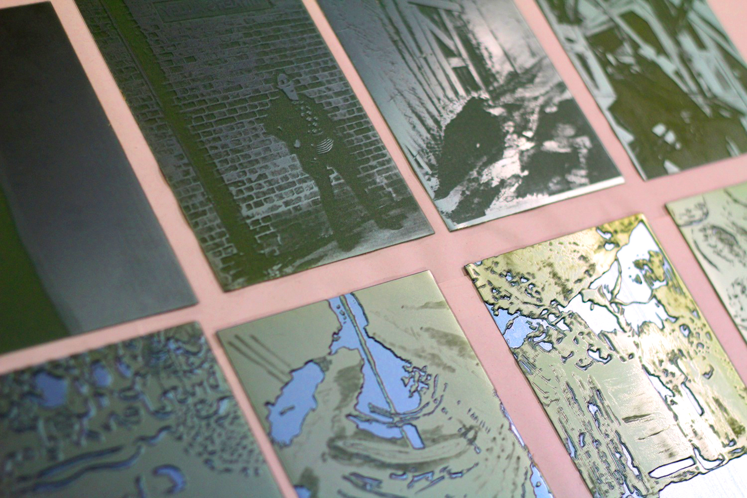 Making photopolymer plates is a magical process that can be used to print incredibly varied marks. Delicate tones are held in photographic images designed to print with the intaglio method (ink is held in the grooves of the plate), and bolder shapes can be achieved with the option of slightly thicker plates exposed for relief printing (ink sits on the top surface of the plate).