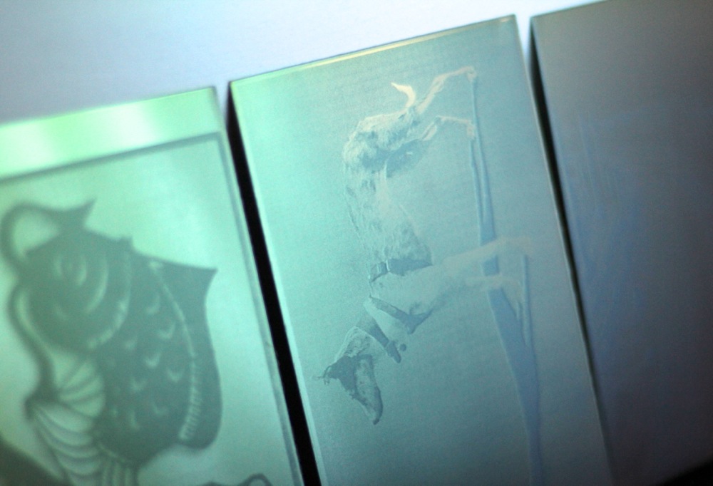 Making photopolymer plates is a magical process that can be used to print incredibly varied marks. Delicate tones are held in photographic images designed to print with the intaglio method (ink is held in the grooves of the plate), and bolder shapes can be achieved with the option of slightly thicker plates exposed for relief printing (ink sits on the top surface of the plate).